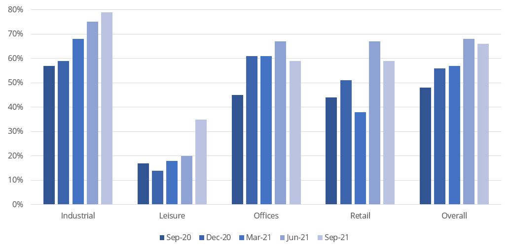 Retail has continued to perform well with Shopping Centres and Out of Town posting the highest figures since before the pandemic.  High Street is not so positive having fallen from 77% last quarter to 55% - possibly an indication trade has fallen back after the initial peak post lockdown although let’s face it the weather can’t have helped!